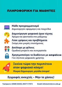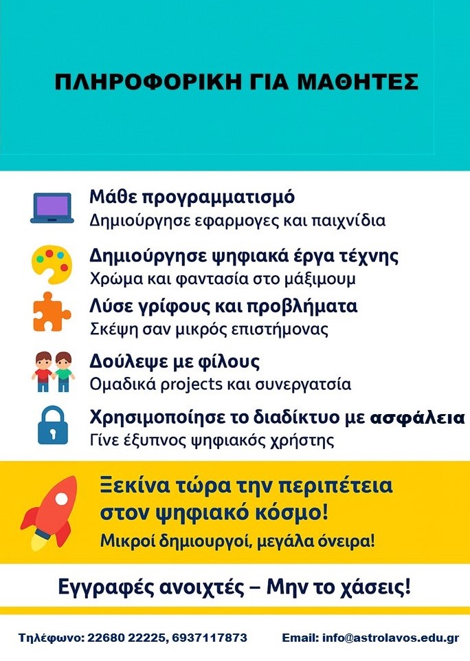 Τα παιδικά τμήματα για την εκμάθηση των υπολογιστών και την εισαγωγή των μικρών μαθητών στις βασικές αρχές της Πληροφορικής ασχολούνται με ένα ευρύ γνωστικό πεδίο. Aπό τη δημιουργία του πρώτου τους αρχείου ως και την ανάπτυξη των πρώτων γραμμών κώδικα, από τη γνωριμία τους με το Διαδίκτυο ως και την πρώτη τους σχέση με τη ρομποτική. Μέσα από τη διαδικασία αυτή τα παιδιά αντιλαμβάνονται, με διασκεδαστικό τρόπο, την έννοια του προγραμματισμού και αποκτούν οικειότητα με θεμελιώδεις αρχές της Επιστήμης της Πληροφορικής.